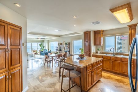 Al entrar, te recibe un diseño de concepto abierto que conecta a la perfección la cocina, el comedor y la sala. La cocina está equipada con electrodomésticos de acero inoxidable, isla central, amplios gabinetes de madera y cubiertas de granito — todo con una increíble vista al Pacífico. Desde la sala tienes acceso a un amplio balcón que recorre todo el frente del departamento y que comparte con la suite principal, donde también encontrarás un asador empotrado y una vista panorámica a la playa.
